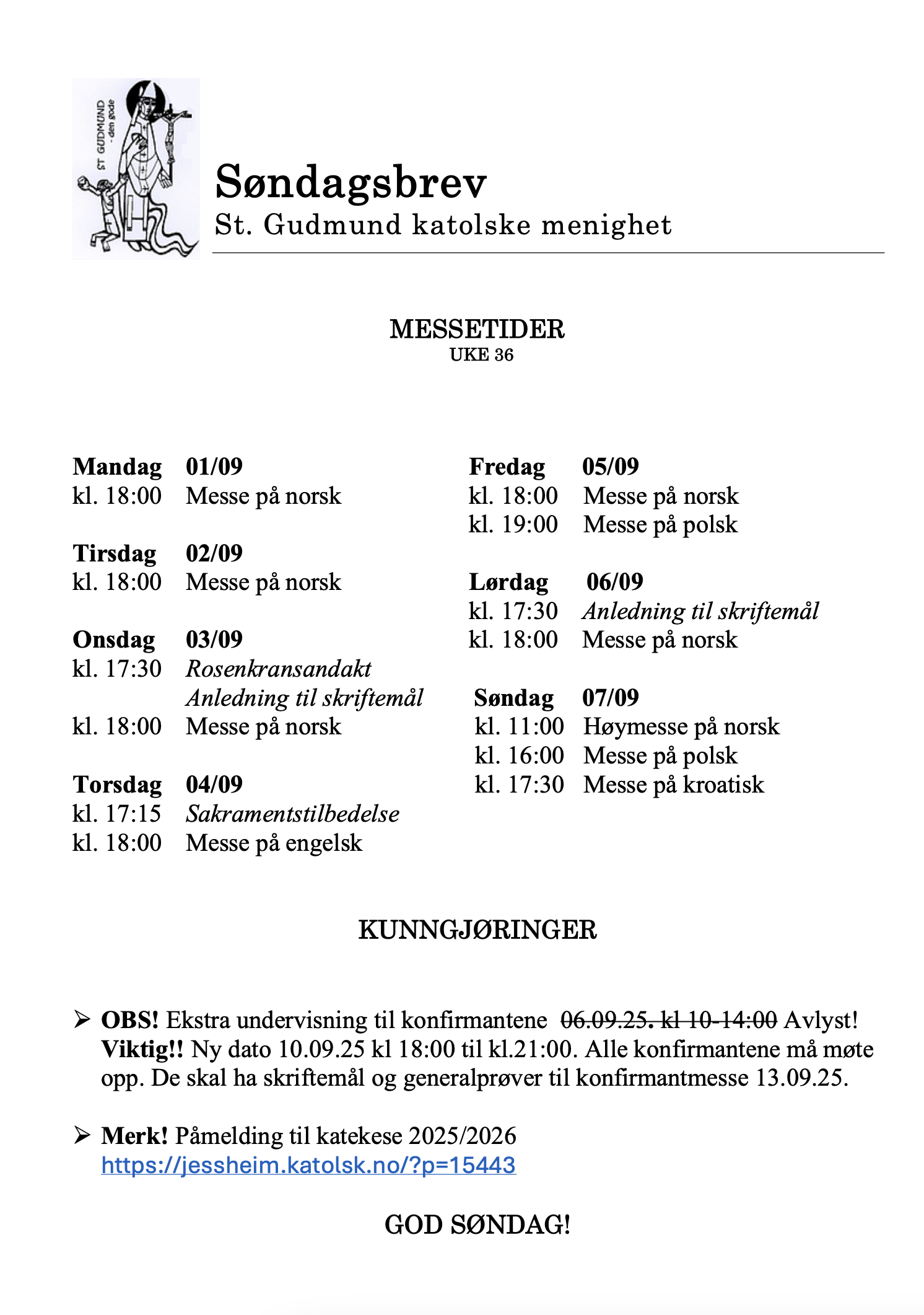Aktiviteter, Info, Kunngjøringer, Søndagsbrev