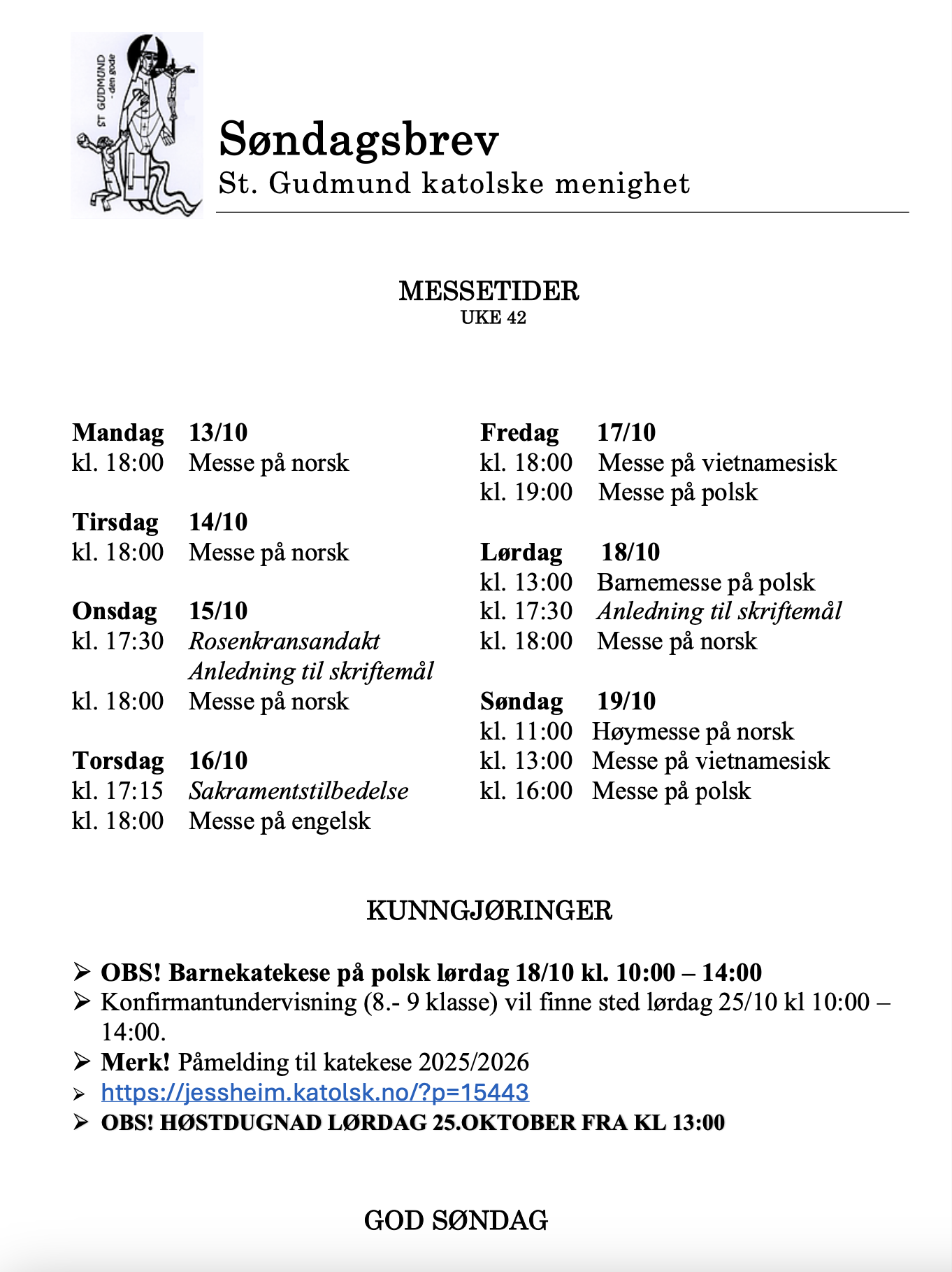 Aktiviteter, Info, Kunngjøringer, Søndagsbrev