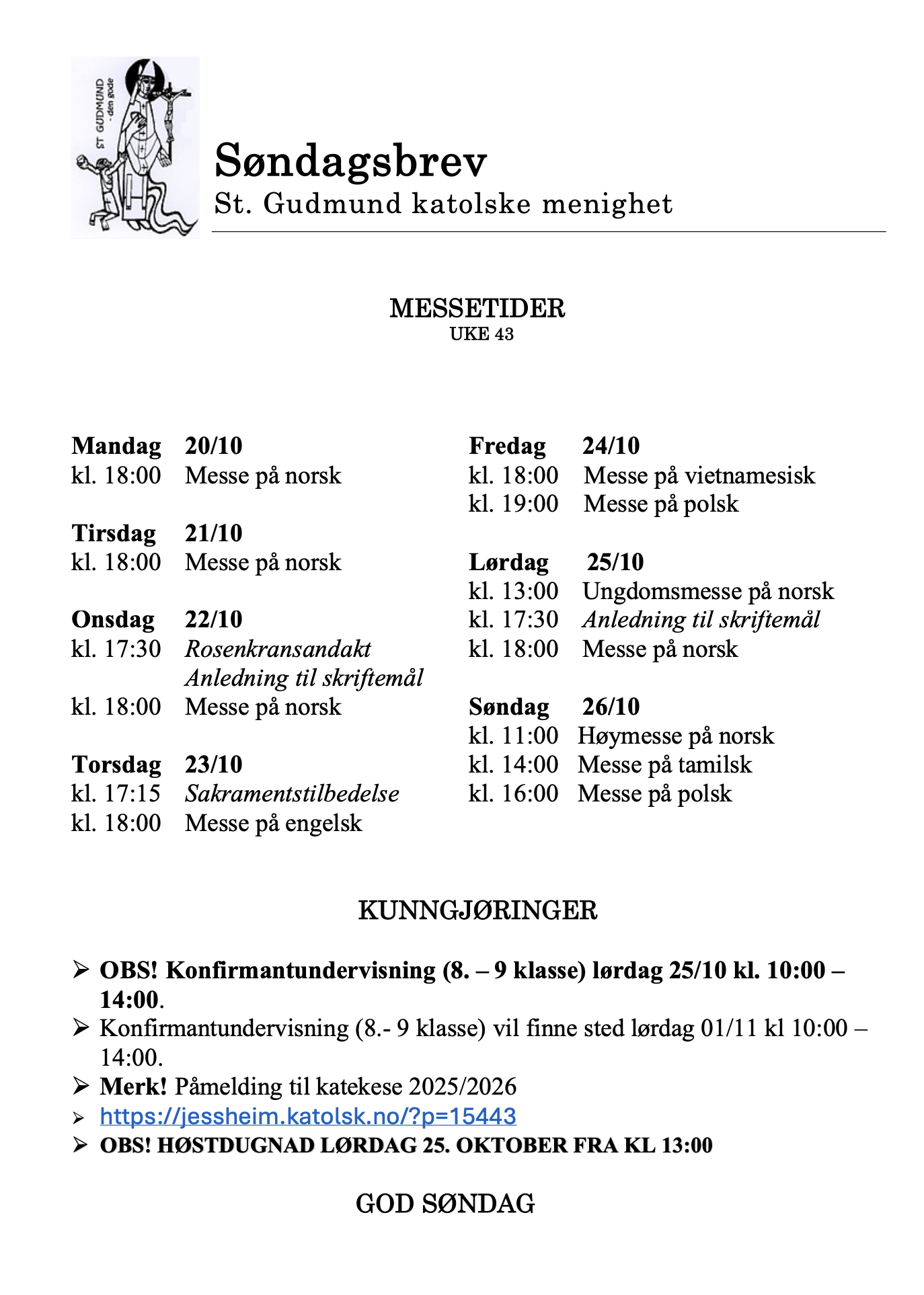 Aktiviteter, Info, Kunngjøringer, Søndagsbrev