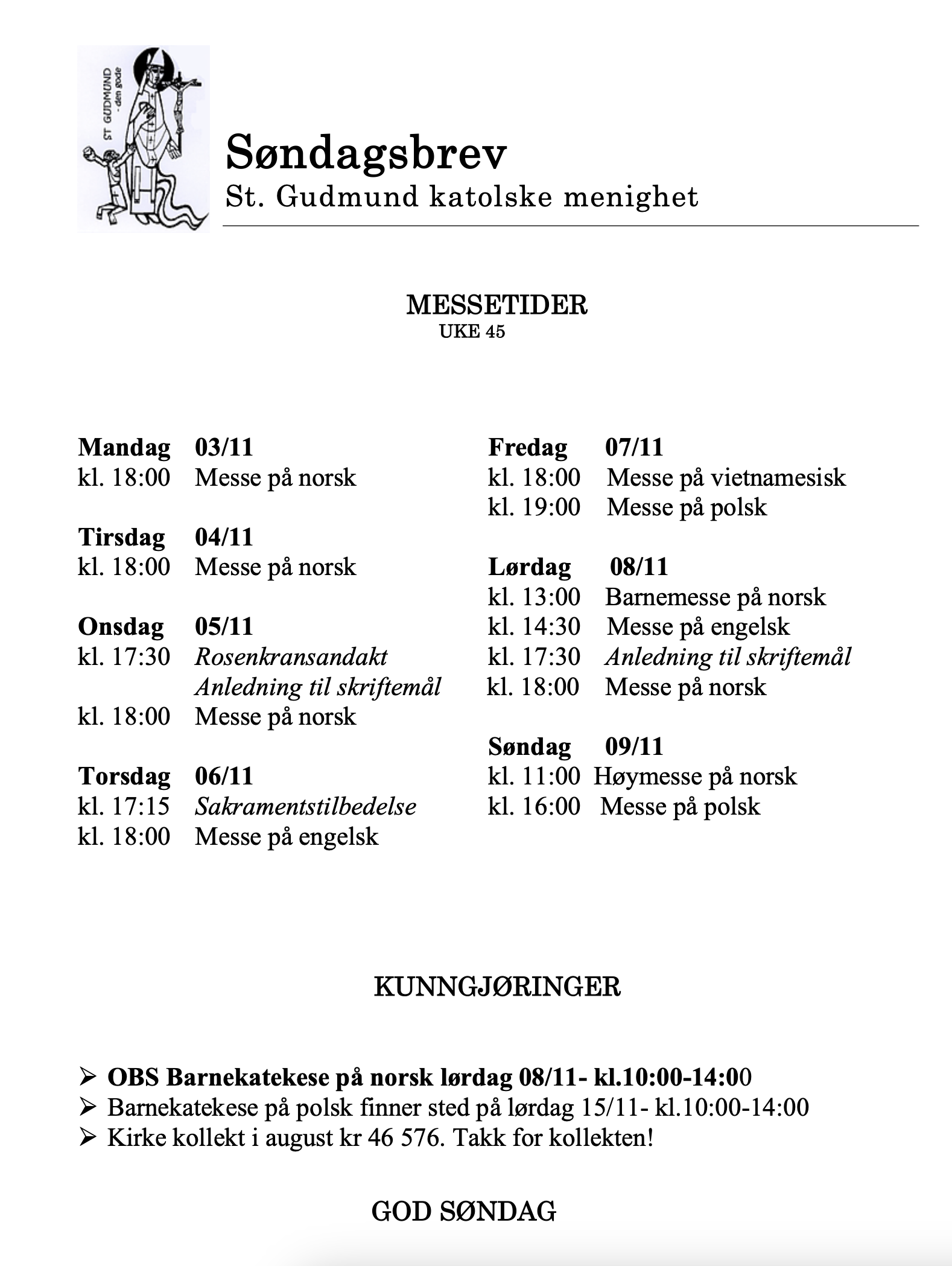 Aktiviteter, Info, Kunngjøringer, Søndagsbrev